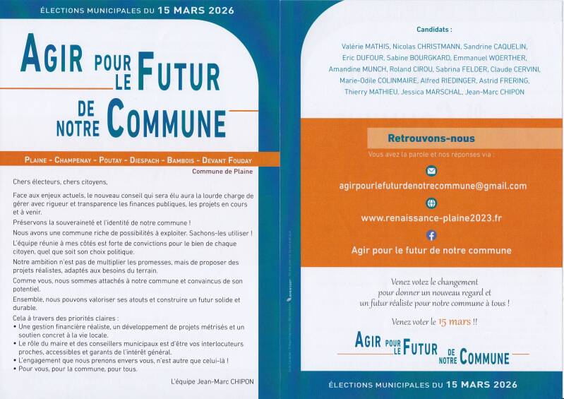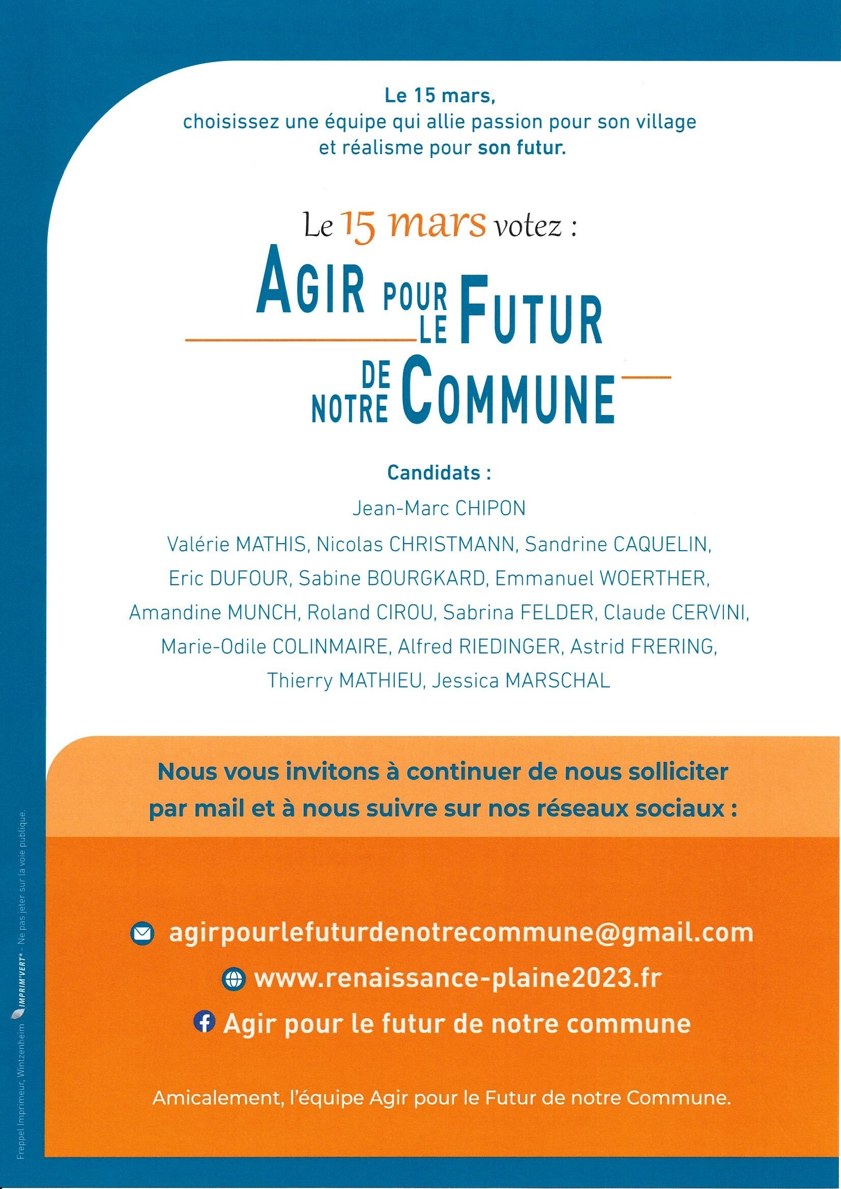 Nous avons le plaisir de vous présenter l'affiche de notre équipe Agir pour le Futur de notre Commune et vous attendons le 15 mars au bureau de vote.